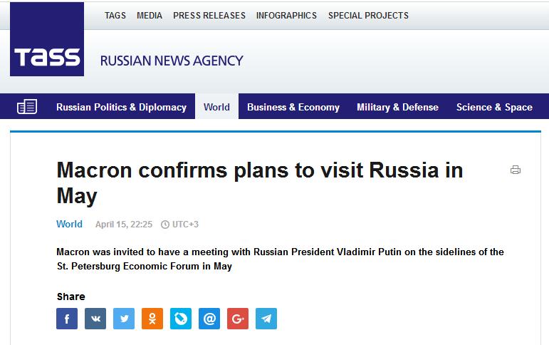 俄罗斯卫星通讯社4月16日报道称,法国总统马克龙在美英法联军对叙利亚实施打击后的第二天证实,将于5月份访问俄罗斯。